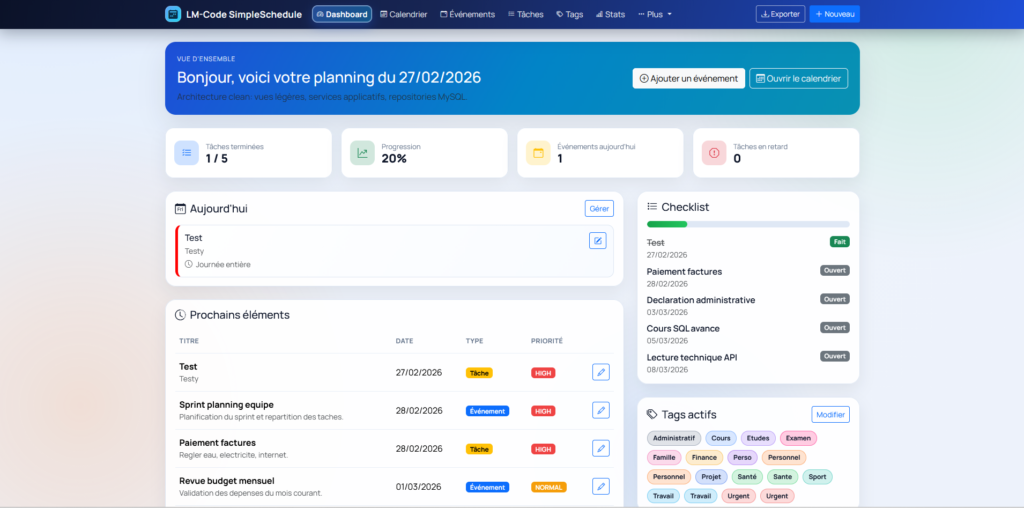 Hello, dans ce court tutoriel, je vais vous présenter une appli assez simple et pratique et nous allons voir ensemble comment la construire. Il s’agit d’ une application de planning complète en PHP et MySQL, sans framework, en adoptant une architecture propre et structurée. L’objectif n’est pas seulement de faire fonctionner un calendrier, mais de comprendre comment concevoir une application maintenable, évolutive et correctement organisée.