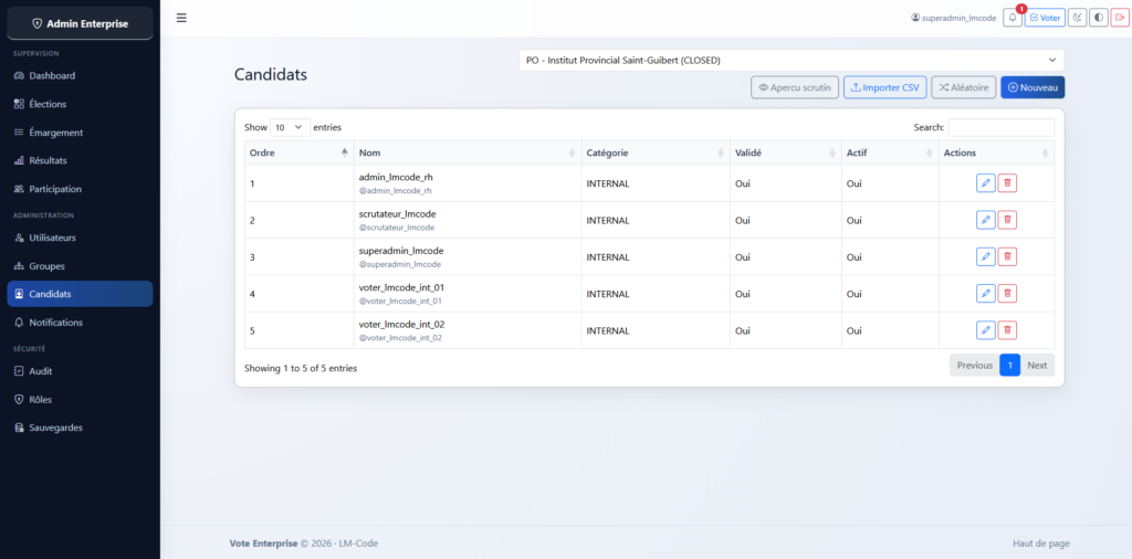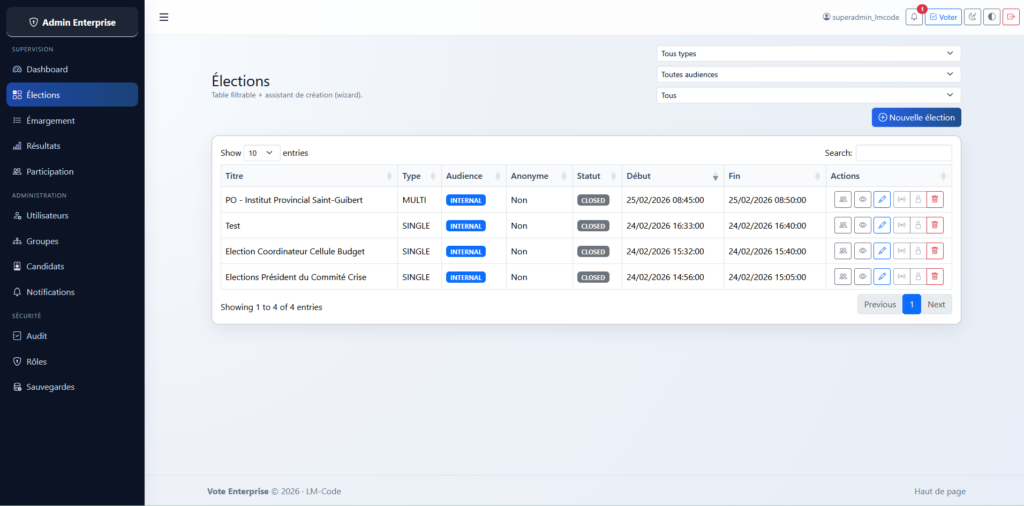 Règle centrale pour ADMIN : Un ADMIN ne peut modifier ou supprimer qu’un scrutin dont il est le propriétaire. Le SUPERADMIN conserve un droit global sur l’ensemble des scrutins.