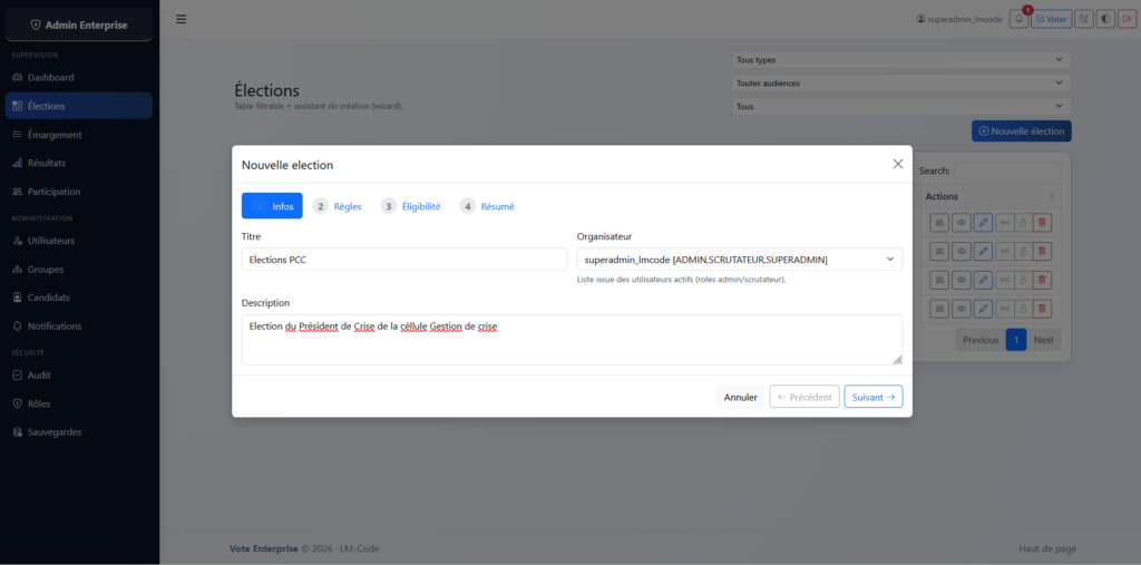 L’administrateur crée ou modifie un scrutin à travers un processus guidé étape par étape (informations générales, règles, éligibilité, résumé).