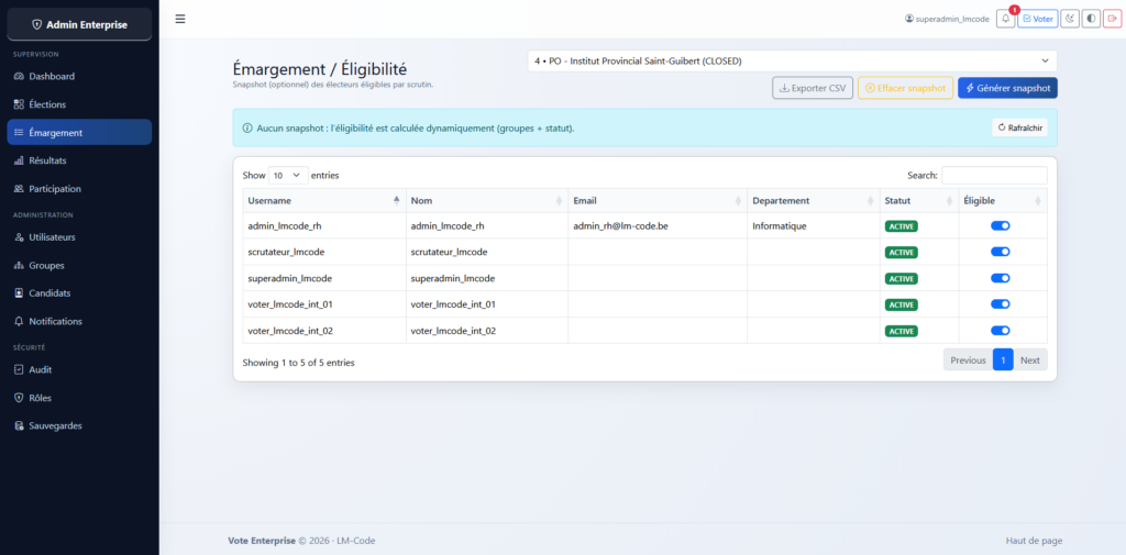 Le module Candidats autorise l’ajout d’utilisateurs existants, la création rapide d’utilisateurs externes associés au scrutin, la synchronisation des candidats et le contrôle de cohérence audience/candidat. Un module d’émargement permet de figer la liste des électeurs éligibles et d’ajuster l’éligibilité si nécessaire, tandis qu’un module de participation assure un suivi en temps réel des votants, le calcul du taux de participation et l’export CSV.