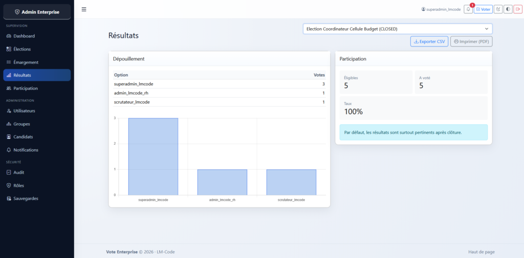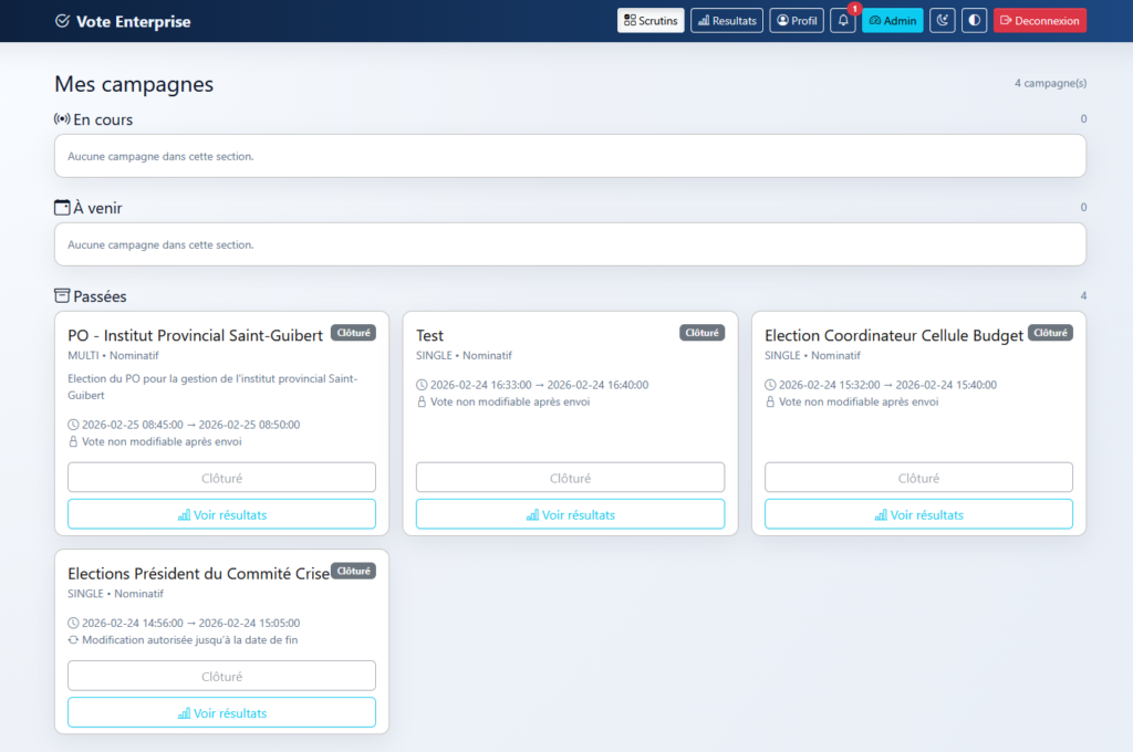 - un back-office admin capable de créer et piloter des scrutins, suivre la participation en direct, gérer les utilisateurs et consulter les résultats.