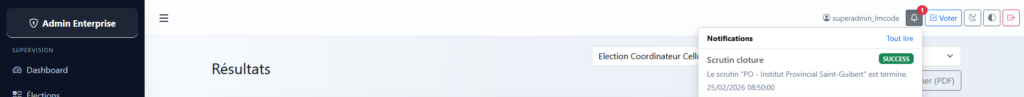 Le système inclut des notifications administratives et in-app, des push navigateur et des déclencheurs automatiques (publication, vote enregistré, clôture), ainsi qu’un mécanisme de clôture automatique des scrutins expirés, exécuté via portail, API et script CLI, avec audit et notification.